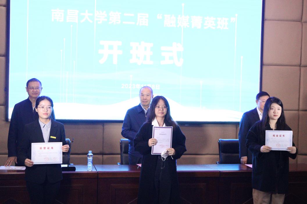 图:南昌大学第二届“融媒菁英班”同学与领导嘉宾合影 新闻与传播学院党委书记舒涛主持开班式,并介绍融媒菁英班学生选拔情况,刘耀彬作开班讲话。与会嘉宾为第一届“融媒菁英班”同学代表颁发获奖荣誉证书、结业证书,并为第二届“融媒菁英班”学员代表颁发录取通知书。