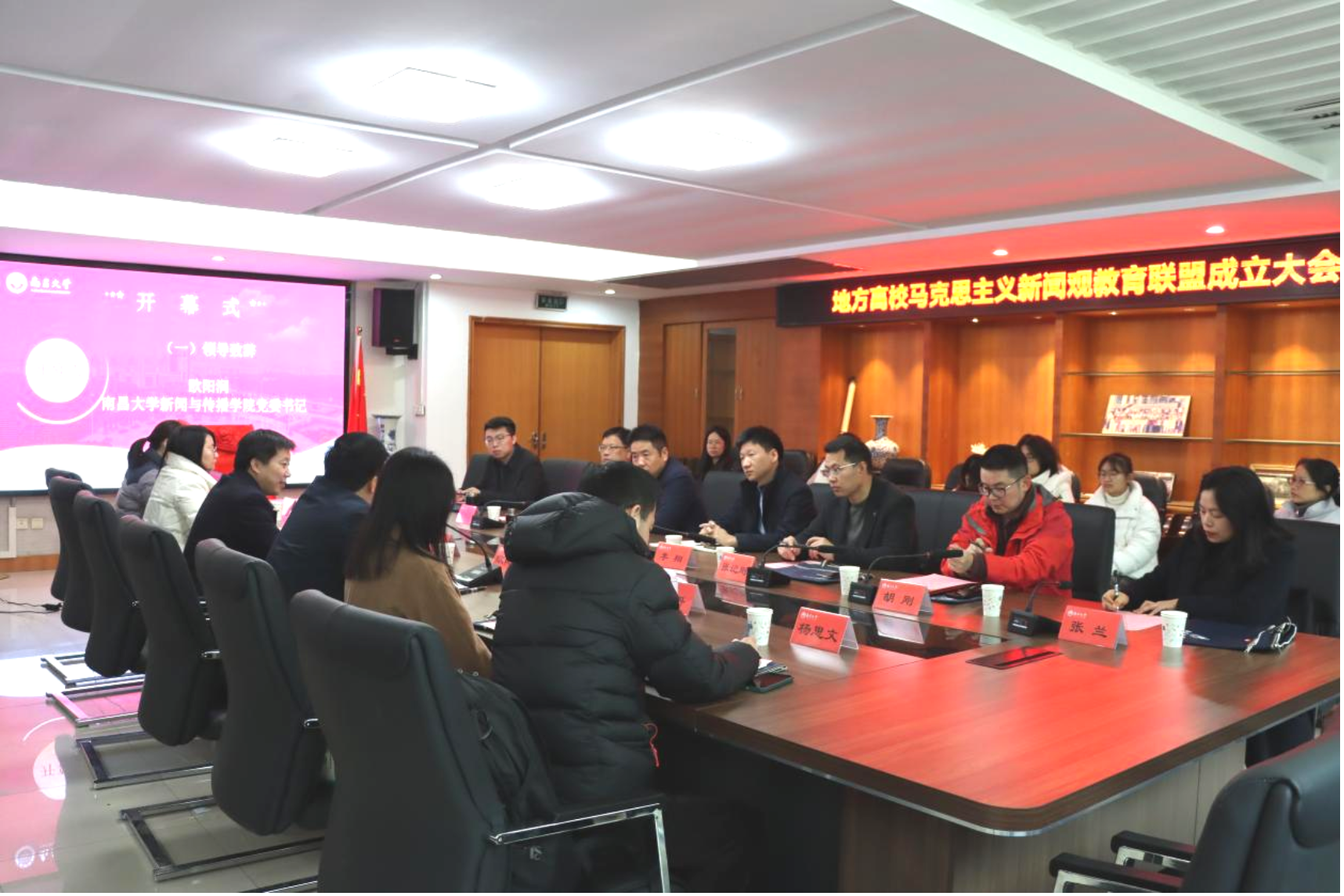 南昌大学新闻与传播学院党委书记欧阳润出席并致辞,副院长王亿本教授主持会议。 大会审议并表决通过了《地方高校马克思主义新闻观教育联盟章程》以及联盟理事会、联盟秘书处人员构成名单。