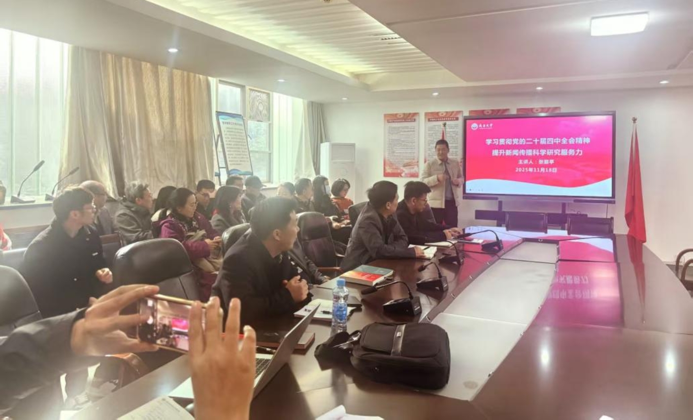 2025年11月18日下午,新闻与传播学院举办党的二十届四中全会精神学术宣讲会。分管科研工作副院长以《学习贯彻党的二十届四中全会精神,提升新闻传播科学研究“服务力”》为题,结合会议精神和学院学科发展、科学研究情况进行学术宣讲。全院教职工参加。