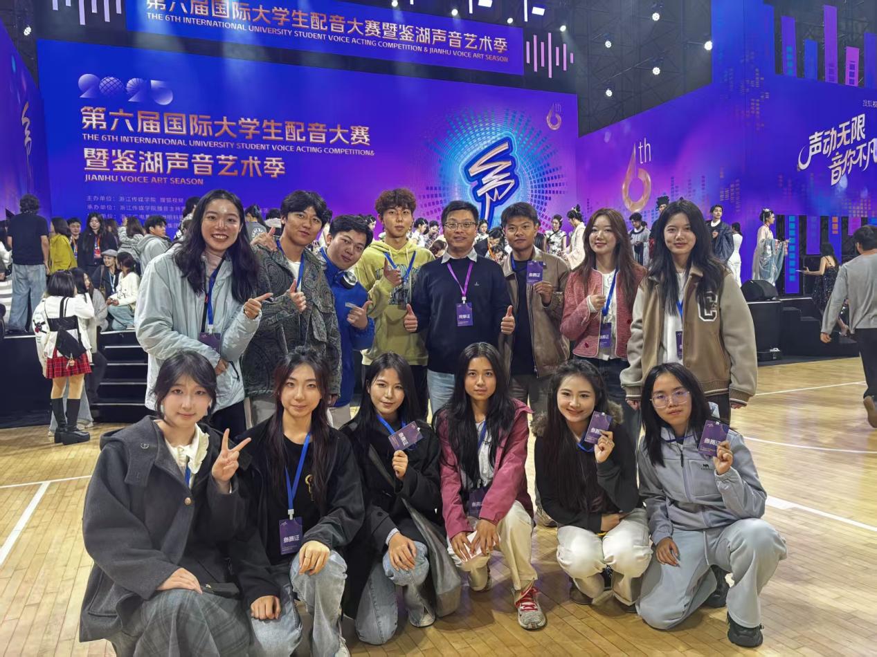 在刚刚落幕的第六届国际大学生配音大赛中,我院口语传播系学子凭借扎实的专业能力和出色的现场表现,在众多参赛队伍中脱颖而出,共获得全国特等奖1项、一等奖1项、三等奖2项,奖项涵盖广告、动漫配音两个赛道。 10月30日晚,由中国高等院校影视学会指导,浙江传媒学院与搜狐视频联合主办的第六届国际大学生配音大赛暨鉴湖声音艺术季在绍兴市柯桥区体育中心体育馆开幕。这场汇聚全球高校配音人才的顶级赛事,共吸引全球437所院校、15618件作品激烈角逐。 来自播音231班的钟乐仪、任润天、吴童、王湛翔四名同学一路过关斩将,最终以全国第七的名次荣获动漫游戏组全国特等奖,创下我校在该项赛事取得的最好成绩。 此外,播音241班王海博同学荣获广告片组全国一等奖,播音241班的魏子涵、黄子昌两位同学获动漫游戏组全国三等奖。播音251班的浦砻宁、武怡含、张玥莹、刘子钰、刘琼尹、刘美萍六位同学获动漫游戏组全国三等奖。我院口语传播系蔡静、钟鸣、张佳妮、刘擎四位老师获优秀指导教师奖。我校获优秀组织奖。