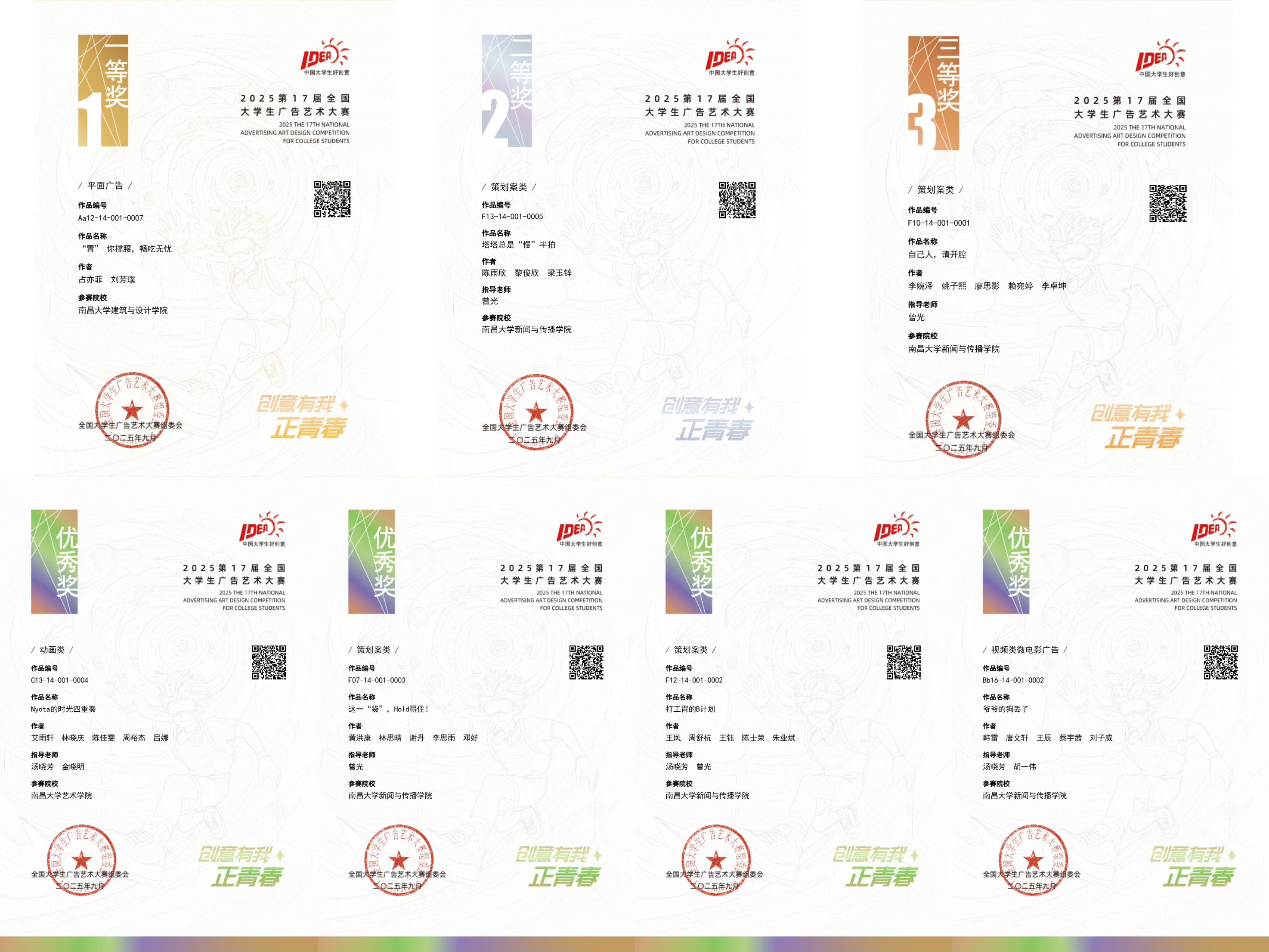 (国赛获奖证书) 南昌大学新闻与传播学院作为本届大广赛的校赛主办单位,积极组织校内选拔与作品征集工作,通过精心策划与公平评审,成功遴选并推送了一批创意突出、制作精良的优秀作品参与省级和国家级竞赛,为最终取得优异成绩奠定了坚实基础。 全国大学生广告艺术大赛是纳入高校学科竞赛评估的重要赛事,是深化实践教学、推动产学结合的重要平台。学院始终坚持“以赛促教、以赛促学”,通过竞赛反哺教学,不断探索创新人才培养模式,有效提升了学生的专业素养和综合能力,展现了学院在广告创意教育方面的扎实成效。