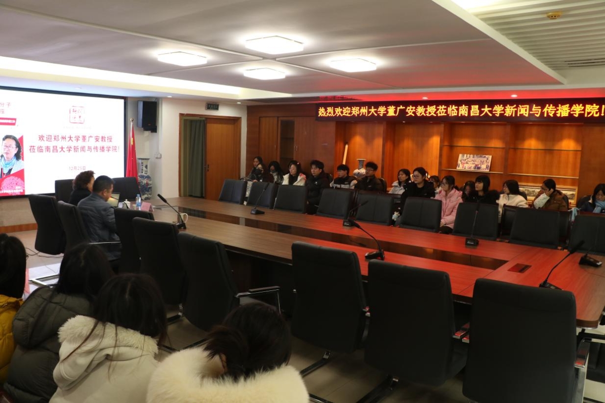 12月25日上午,郑州大学董广安教授应邀到我院,以《学习穆青精神,做好智媒时代的新闻传播工作》为题作专题讲座。本次讲座也是我院“新闻传道”系列学术讲座第41期。学院教师和50多名研究生、本科生入党积极分子参加。